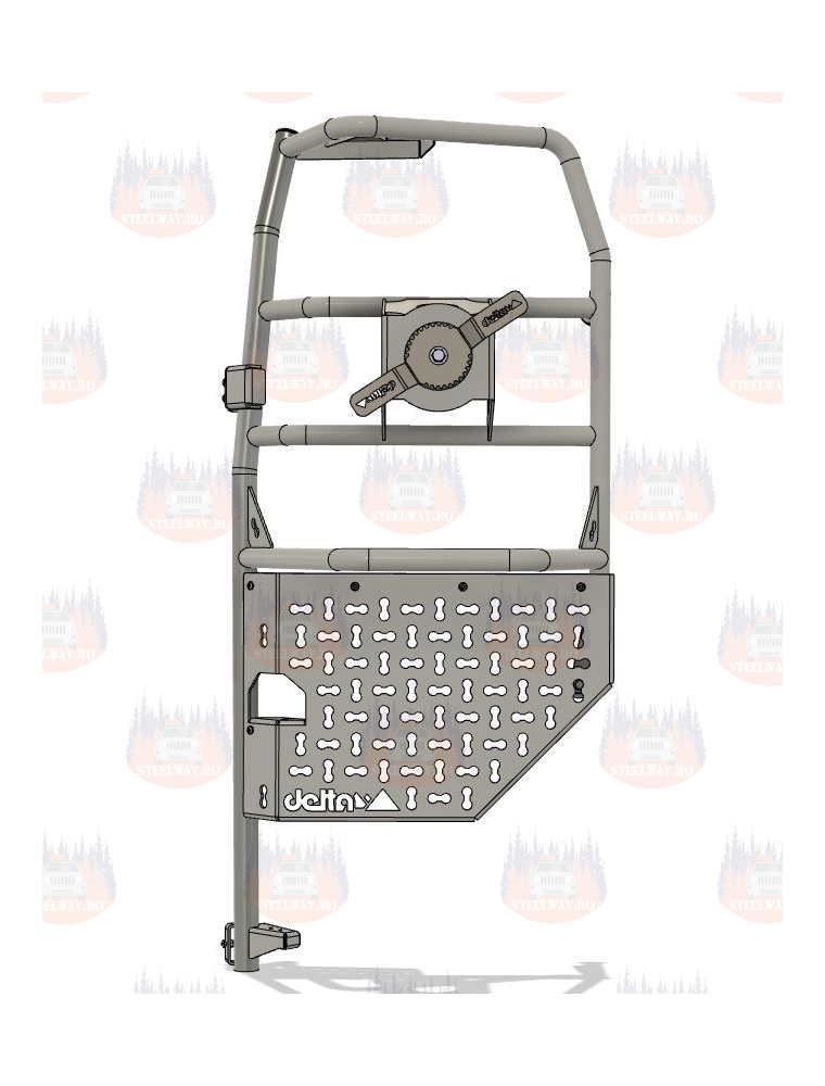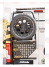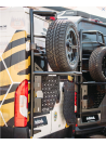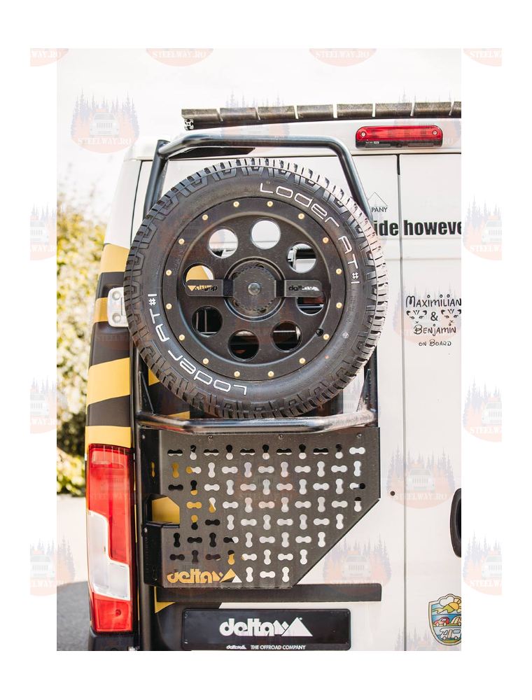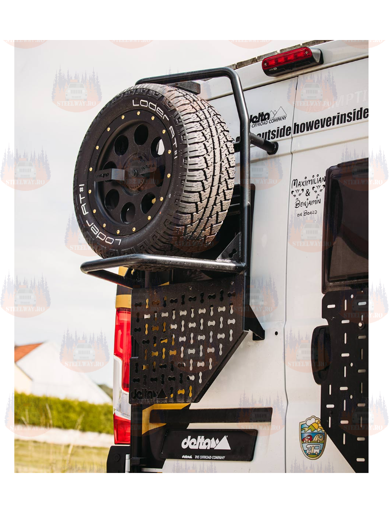 Noul suport pentru roata de rezervă delta combină funcția de suport pentru roata de rezervă cu o funcție de scară. Construcția tubulară foarte stabilă transportă roți de până la 285/60R18. Este atașat la balamalele portierei din spate de pe partea șoferului și direct la portiera din spate cu ajutorul a 2 fitinguri cu șurub. Suportul este acoperit cu pulbere pentru o protecție excelentă împotriva coroziunii.