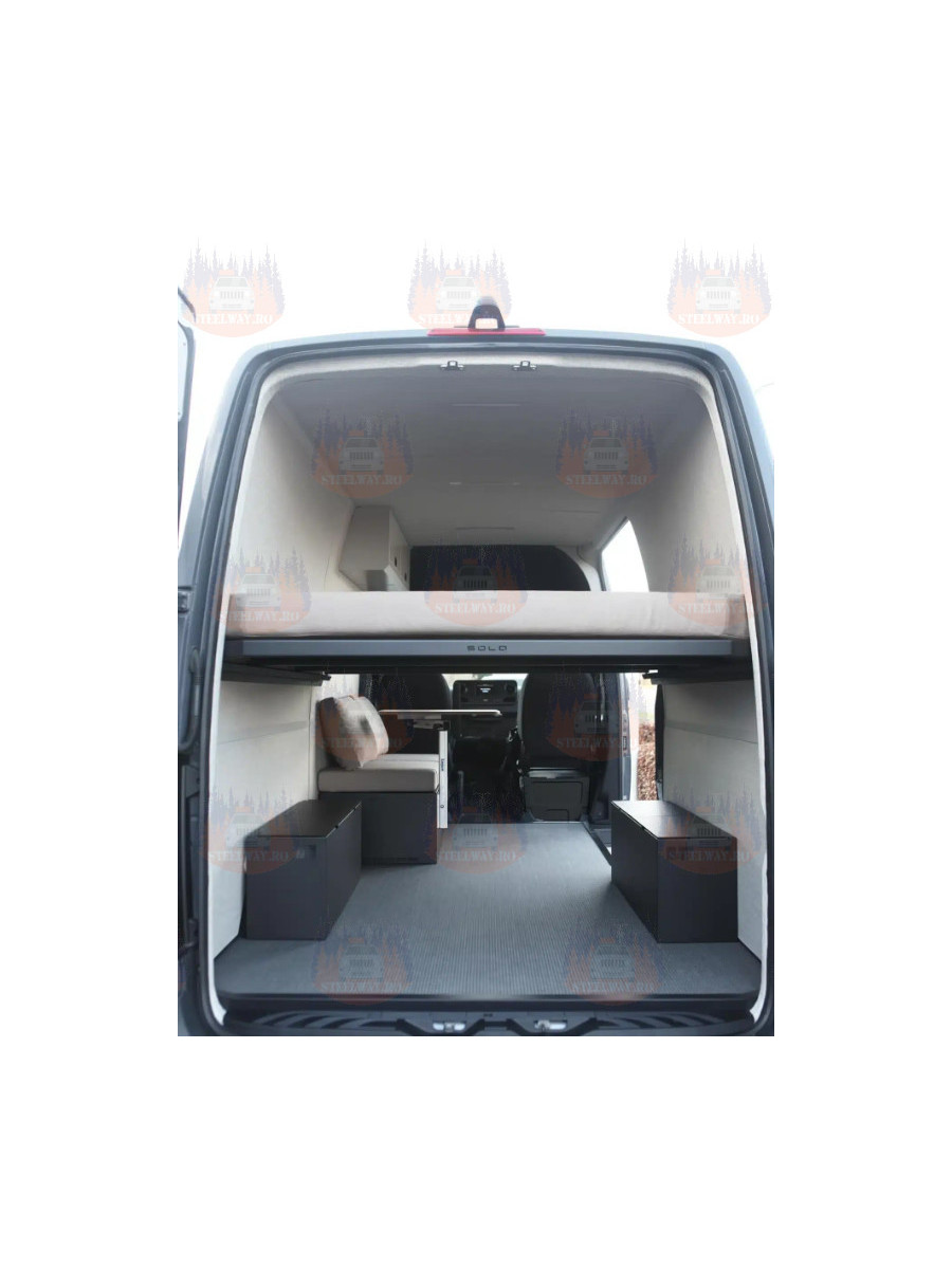 Patul glisant inovator cu 3 panouri vă permite să maximizați spațiul de depozitare sub pat, fiind ideal pentru montarea bicicletelor, depozitarea echipamentelor voluminoase sau menținerea ordinii în interiorul rulotei. Fiecare panou poate fi îndepărtat individual, permițând accesul la întreaga zonă de încărcare atunci când este necesar. Sistemul de pat este ușor, dar robust, asigurând durabilitate fără a compromite utilitatea.