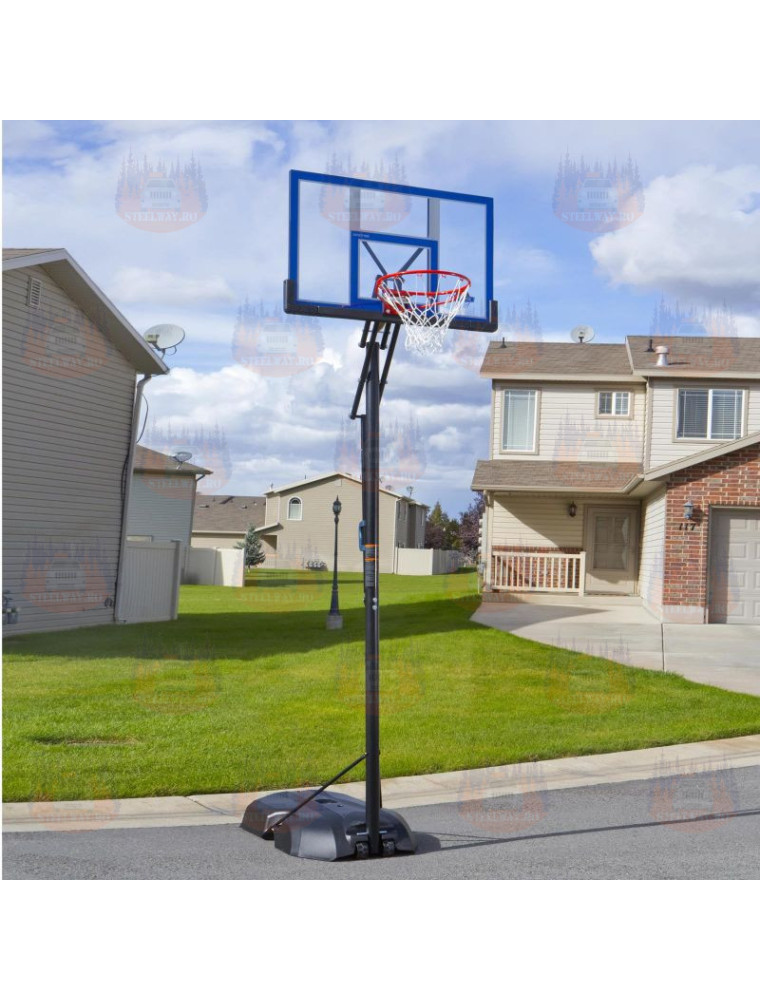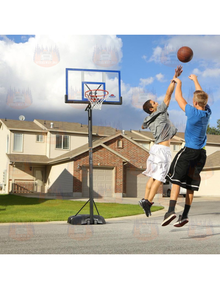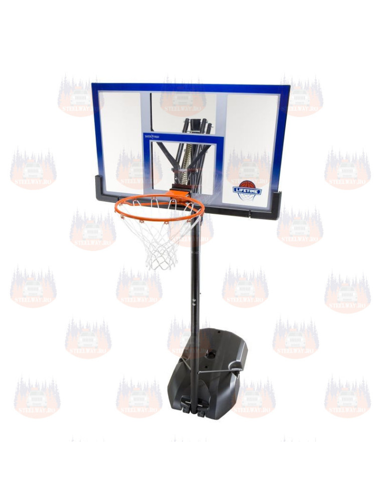 Suportul de baschet portabil are o placă la baza de 48", realizată în tehnologie Steel-Framed Shatter-Proof. Tehnologia Shatter-Proof garantează durabilitatea pe termen lung și rezistența la impact datorită acoperirii din policarbonat Makrolon® de cea mai bună calitate. Steel-Framed este o ramă de tablă de fund durabilă din oțel. Protecția suplimentară a marginii inferioare a plăcii și tehnologia de reglare a înălțimii Speed Shift® în intervalul 244 - 305 cm cu o singură mână asigură un joc confortabil și sigur la orice nivel de joc. plasă de nailon rezistentă la intemperii și un stâlp rotund cu un diametru de 7,62 cm Role de transport montate într-o bază stabilă umplută cu apă cu o capacitate de 128 de litri asigură mobilitatea și stabilitatea deplină a suportului.
